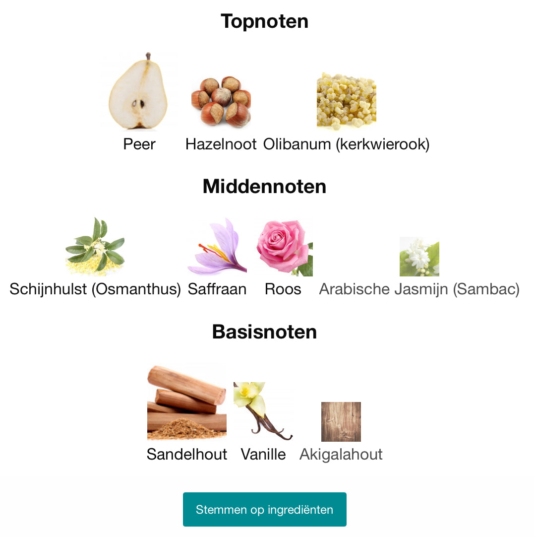 Hartnoten: Bloemige Schijnhulst (Osmanthus), Exotische Saffraan, Zachte Roos, Arabische Jasmijn (Sambac)